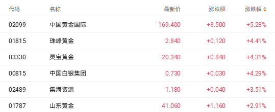 财联社1月12日讯(编辑 胡家荣)受益于市场多重利好刺激,港股市场黄金股表现强劲。截至发稿,中国黄金国际(02099.HK)涨5.28%、珠峰黄金(01815.HK)涨4.41%、灵宝黄金(03330.HK)涨4.31%、中国白银集团(00815.HK)涨4.29%。