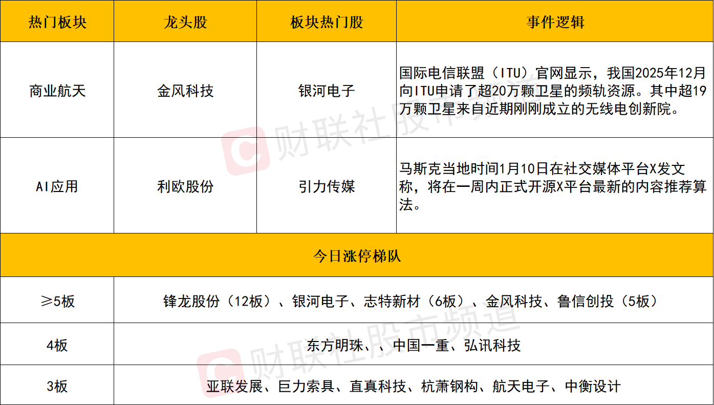 ②短线情绪持续活跃,连续2日超百股涨停,其中AI应用全线爆发,利欧股份等个股涨停,商业航天概念反复活跃,鲁信创投11天9板,中国卫通9天5板。