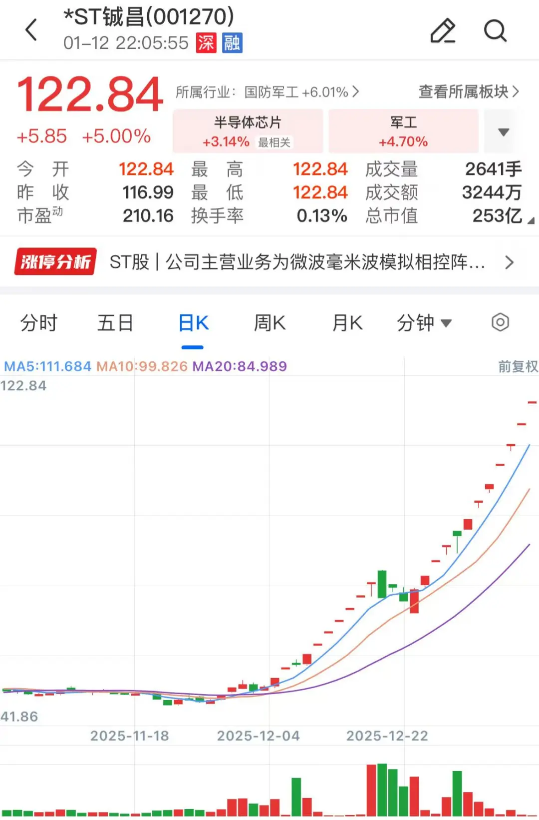 值得一提的是,*ST铖昌股价自去年12月1日以来出现大幅拉升,至今累计涨幅达177%,近11个交易日收获10个涨停板。截至今日,该股报收122.84元/股,总市值为253.2亿元。
