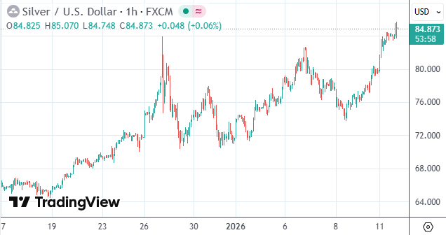 截至发稿,现货白银价格升超6%报每盎司84.87美元,日内一度涨逾7%至85.74美元;现货黄金则一度涨2.4%至每盎司4620.34美元,均刷新了2025年12月下旬录得的历史纪录。