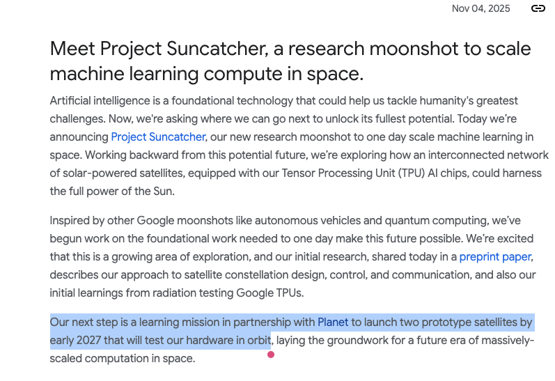 另外,作为资本市场的热点,谷歌筹备将TPU算力芯片送上太空轨道的合作伙伴,正是Planet Labs。两家公司计划在2027年初前发射两颗原型卫星,在轨测试太空算力硬件,为大规模部署奠定基础。