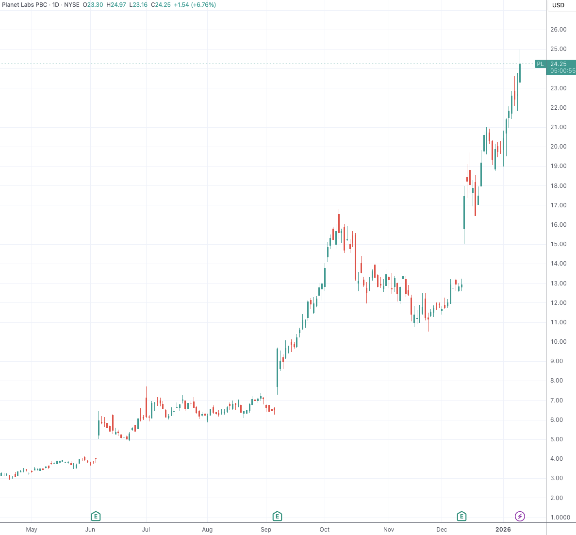 截至发稿,Planet Labs周一开盘后一度涨超9%。公司在2025年录得惊人的388%涨幅后,2026年开年没几天又累计上涨超20%。