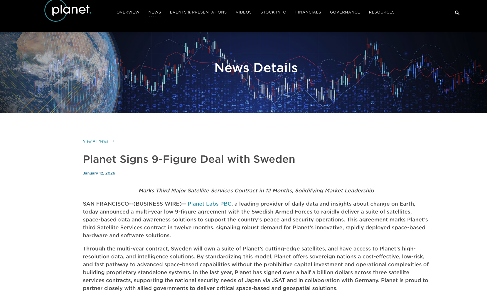 公告披露,与瑞典军方的合同是Planet Labs近12个月内签署的第三份合同,签约金额超过5亿美元。公司预计将在数年内将这些付款确认为收入,同时当前财季的业绩指引不受最新公告影响。