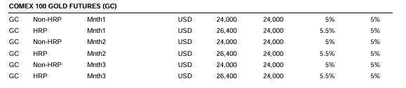 在此次调整前(固定金额),COMEX 100 GOLD FUTURES近月合约Non-HRP客户(非对冲/投机者)的每手初始保证金约为24000美元。