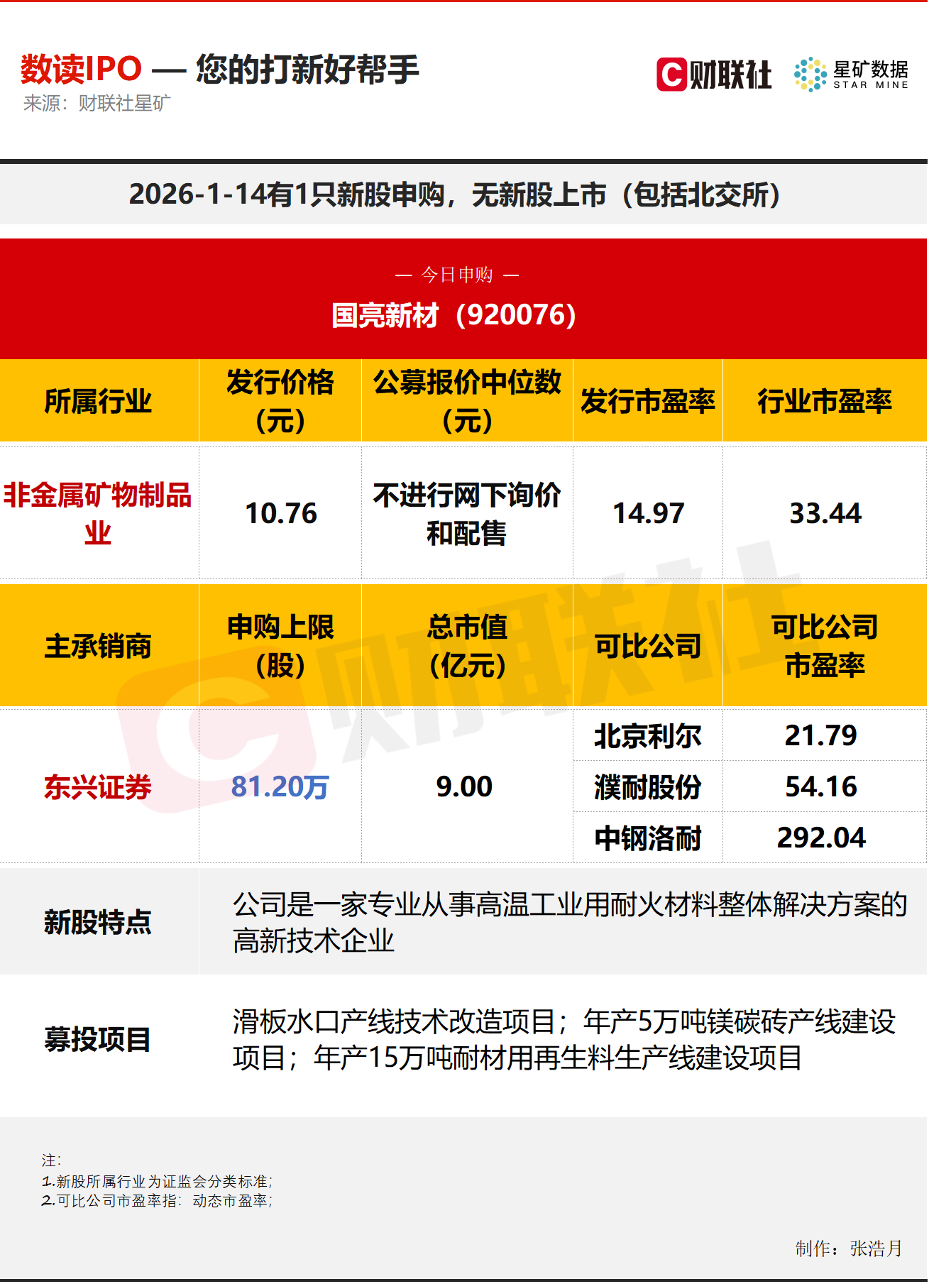 财联社1月14日讯,今日有1只新股申购,为北交所的国亮新材;无新股上市。