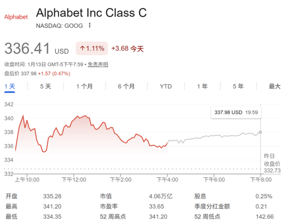 谷歌股价周一上涨约1.1%,报336.41美元,当前市值为4.06万亿美元。而英伟达当前市值为4.52万亿美元。