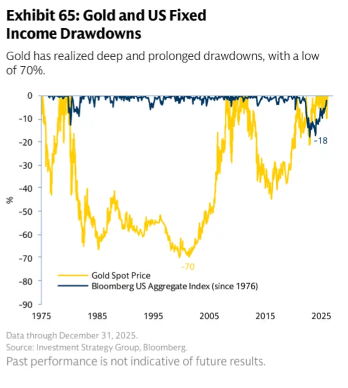 高盛财富管理业务的投资策略团队在其2026年展望报告中警告称,“黄金在历史上出现过深度且持续的回撤,其最大回撤幅度达70%。”。下图通过与美国债券市场进行对比,清晰地展示了这一点。传统上,固定收益被视为投资组合在动荡时期的缓冲。