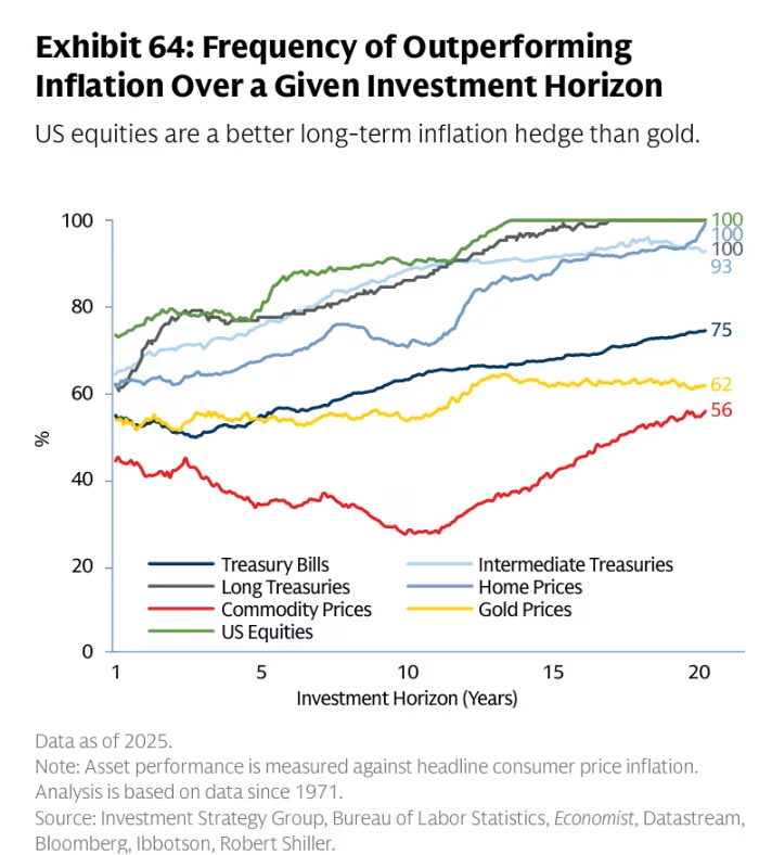 “也就是说,只有大约一半的时间能够产生实际回报。相比之下,正如下图所示,在同一时间框架内,美国股票的表现始终优于通胀。”他补充道。