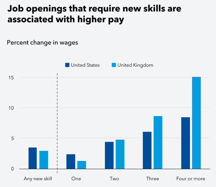 IMF表示,对这类更广泛新技能的需求增加,有利于提升工资和就业水平。在美国和英国,包含新技能要求的岗位,其薪资溢价约为3%至3.4%。