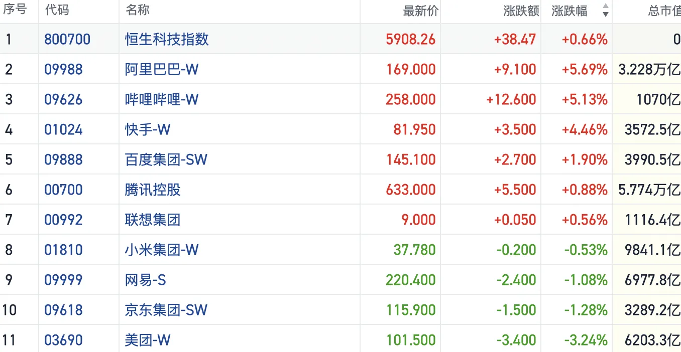 盘面上,今日大型科技股涨跌不一。阿里巴巴大涨超5%,短线4连涨,腾讯、百度均有涨幅,美团则跌超3%,京东跌超1%。