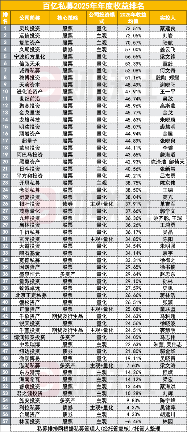 百亿私募排行榜中,灵均投资以73.51%的年度均值拿下冠军,排名二至四名中均为主观多头策略的基金公司,远信投资、复胜投资分别以72.05%、70.57%的回报率取得年度亚军与季军,久期投资年度回报率为57%,排名第四,宁波幻方量化2025年收益均值为56.55%,在百亿私募中排名第五,百亿量化私募中排名第二。