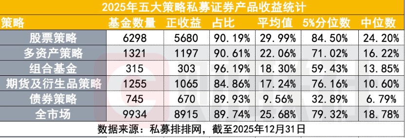 2025年私募基金各策略均展现出独特的竞争力。股票策略以绝对优势成为收益冠军,该策略下6298只产品中有5680只取得正收益,正收益占比90.19%,平均收益率高达29.99%。