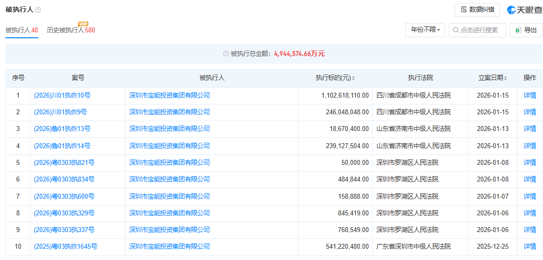 天眼查风险信息显示,宝能集团现存48条被执行人信息,被执行总金额超494亿元。