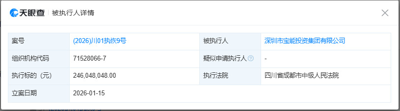 财联社1月16日讯,天眼查天眼风险信息显示,1月15日,深圳市宝能投资集团有限公司、姚振华等新增两则恢复执行信息,执行标的13.4亿余元,执行法院为四川省成都市中级人民法院。