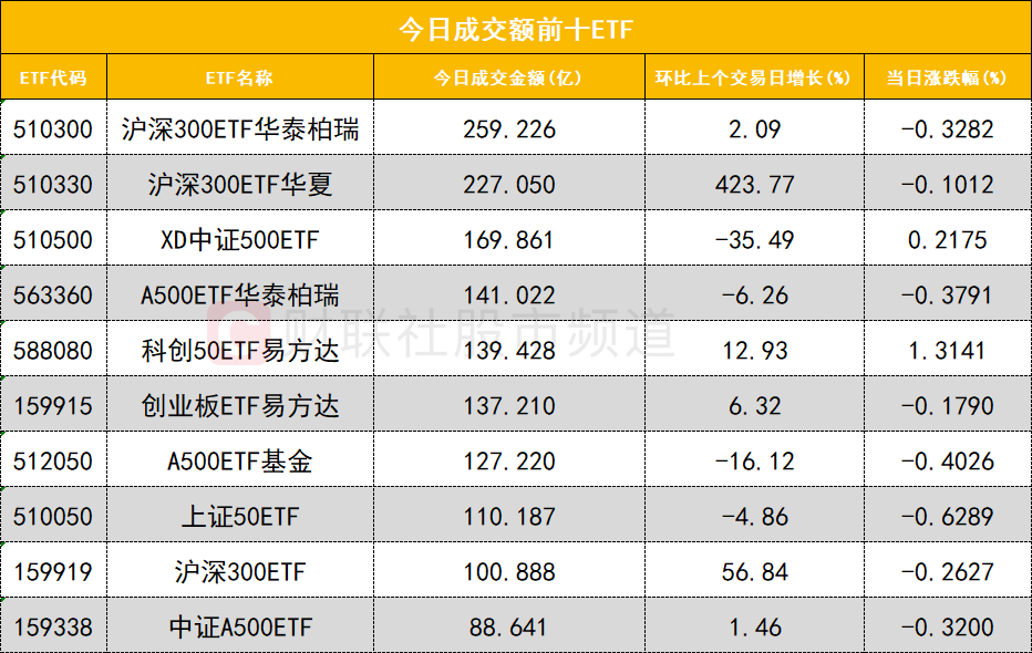从成交额前十的ETF来看,沪深300ETF华泰柏瑞(510300)成交额位居首位,沪深300ETF华夏(510330)成交额位居次席。沪深300ETF华夏(510330)午后分时现放量下挫,成交超250亿,创历史成交天量。