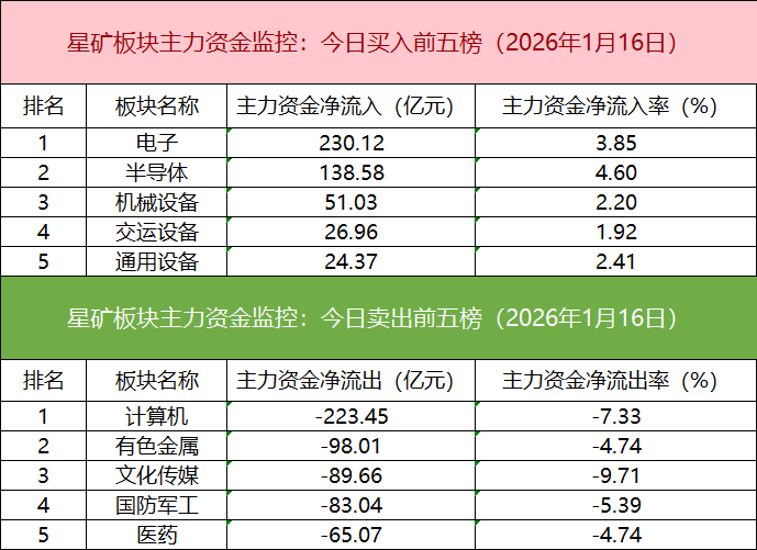 从主力板块资金监控数据来看,电子板块主力资金净流入居首。