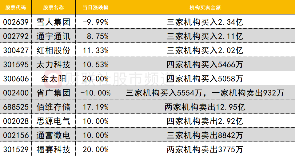 今日龙虎榜机构活跃度较高,买入方面,雪人集团今日跌停,三家机构逆势买入2.34亿。商业航天概念人气股通宇通讯冲高回落,获三家机构买入2.11亿。