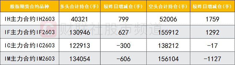 四大期指主力合约中,IH、IF合约多空双方加仓,而IC、IM合约多空双方减仓。