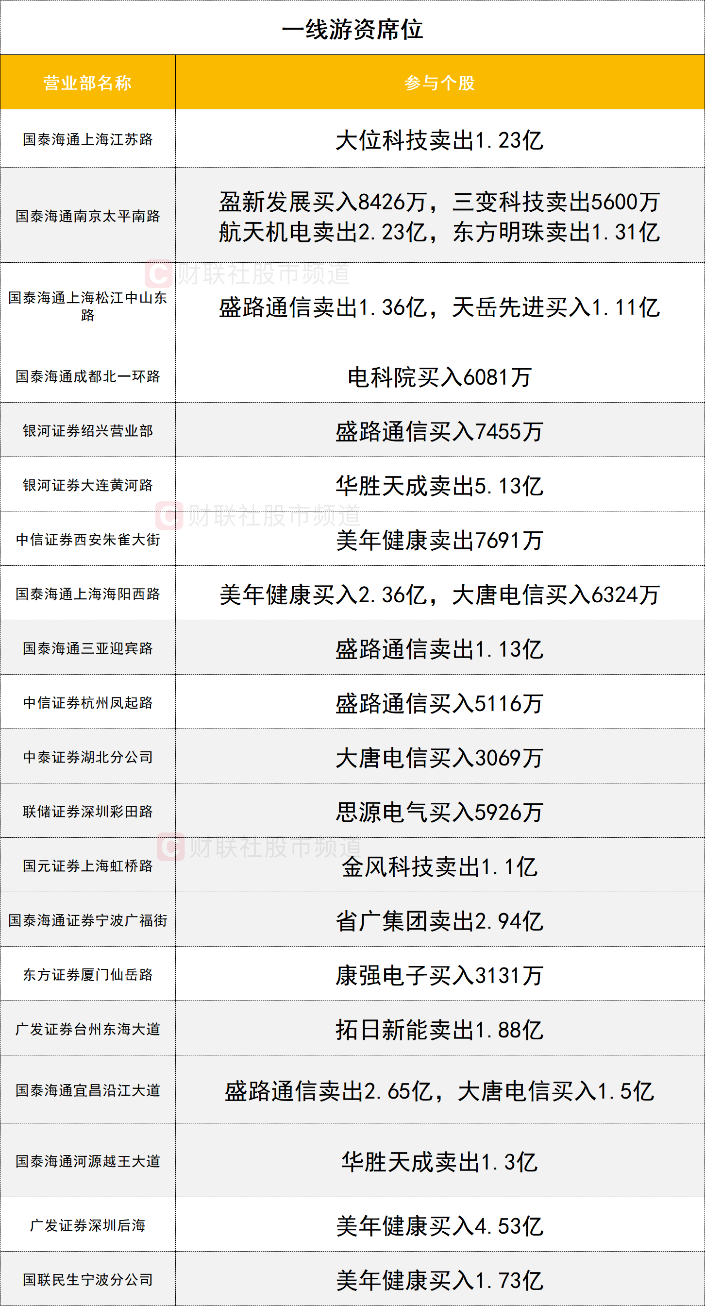 一线游资活跃度较高,美年健康获三家一线游资(广发证券深圳后海、国泰海通证券上海海阳西路、国联民生证券宁波分公司)合计买入8.62亿。
