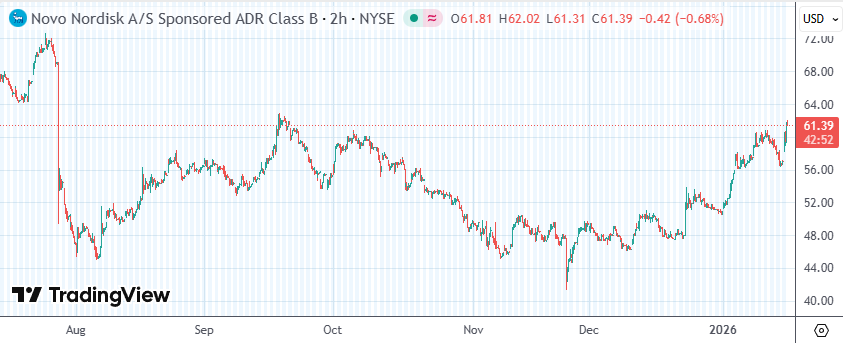 财联社1月17日讯(编辑 赵昊)周五(1月16日)美股盘中,诺和诺德股价暴涨8%,最高时报62.02美元,创去年9月以来的最高水平。