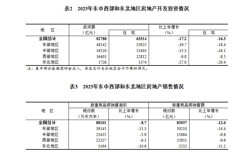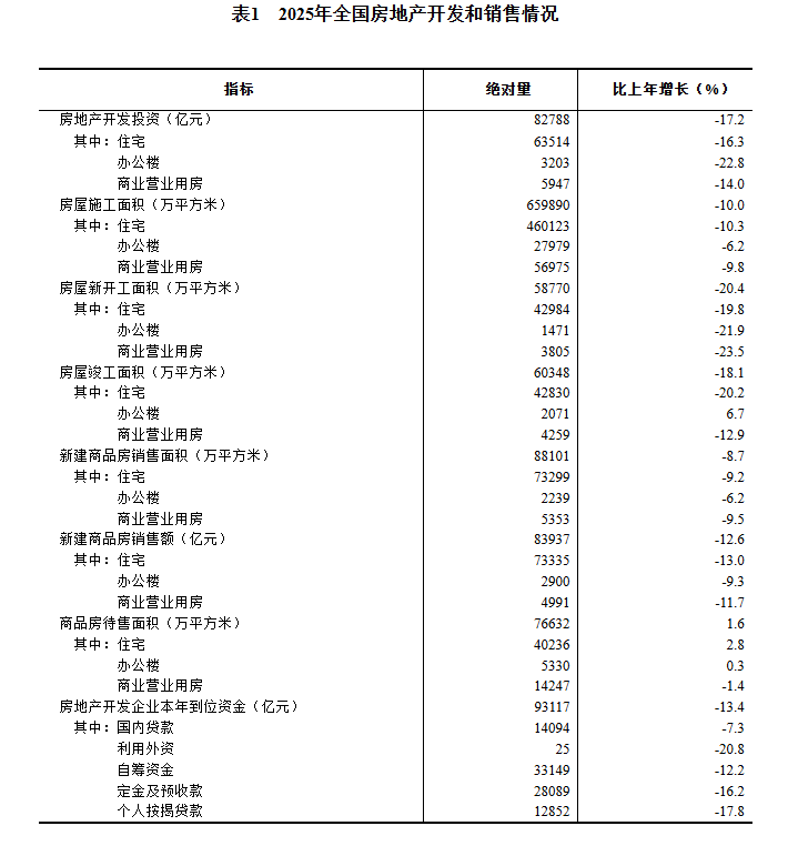 2025年,全国房地产开发投资82788亿元,比上年下降17.2%(按可比口径计算,详见附注6);其中,住宅投资63514亿元,下降16.3%。