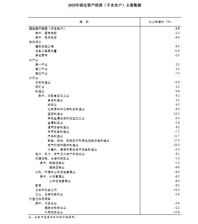 财联社1月19日讯,国家统计局发布数据,2025年,全国固定资产投资(不含农户)485186亿元,比上年下降3.8%(按可比口径计算)。其中,民间固定资产投资比上年下降6.4%。从环比看,12月份固定资产投资(不含农户)下降1.13%。