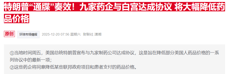 这意味着,部分药品在美国的价格要与加拿大、欧洲、日本等发达国家的价格对齐。截至本月,已有16家跨国药企——从英国的阿斯利康到罗氏旗下的基因泰克——同意下调美国药价。