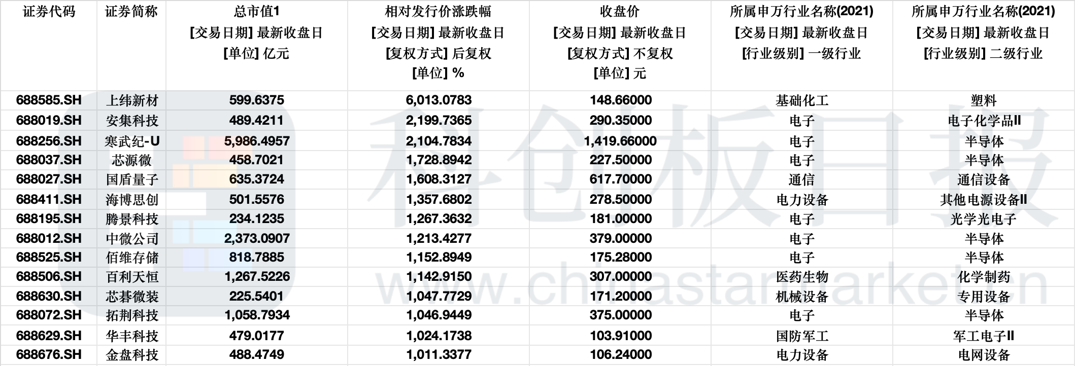 在科创板百元股中,有14家公司截至1月19日的收盘价,较发行价回报已经超过10倍。包括上纬新材、安集科技、寒武纪、芯源微、国盾量子、海博思创、腾景科技、中微公司、佰维存储、百利天恒、芯碁微装、拓荆科技、华丰科技、金盘科技等。