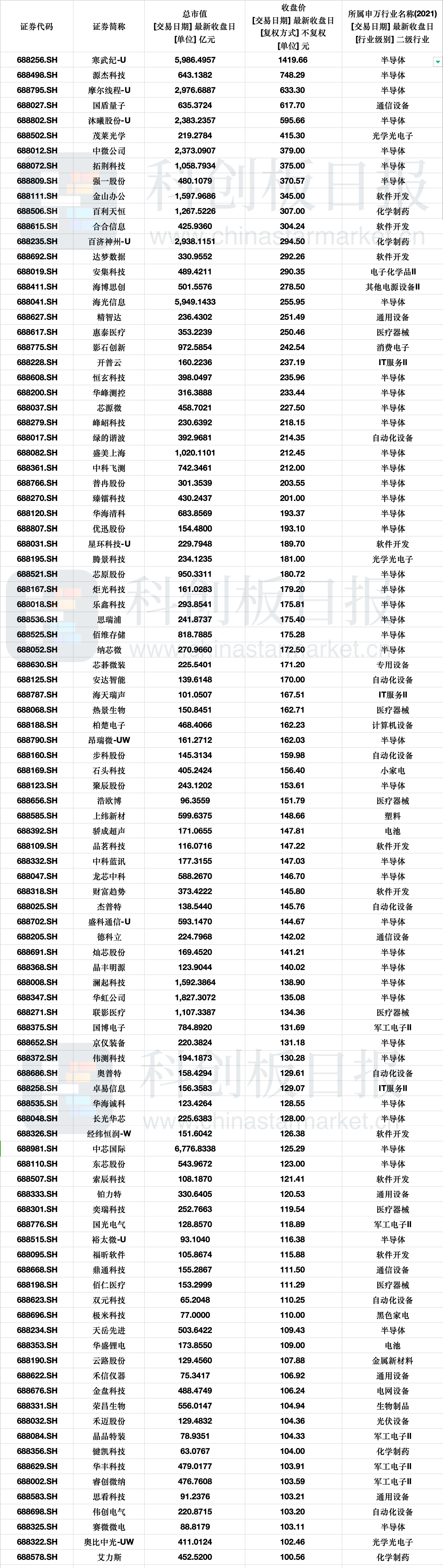 科创板公司百元股数量达到创纪录的100家,数量占A股百元股的半壁江山。并且在科创板公司中,有30家股价已超200元/股。
