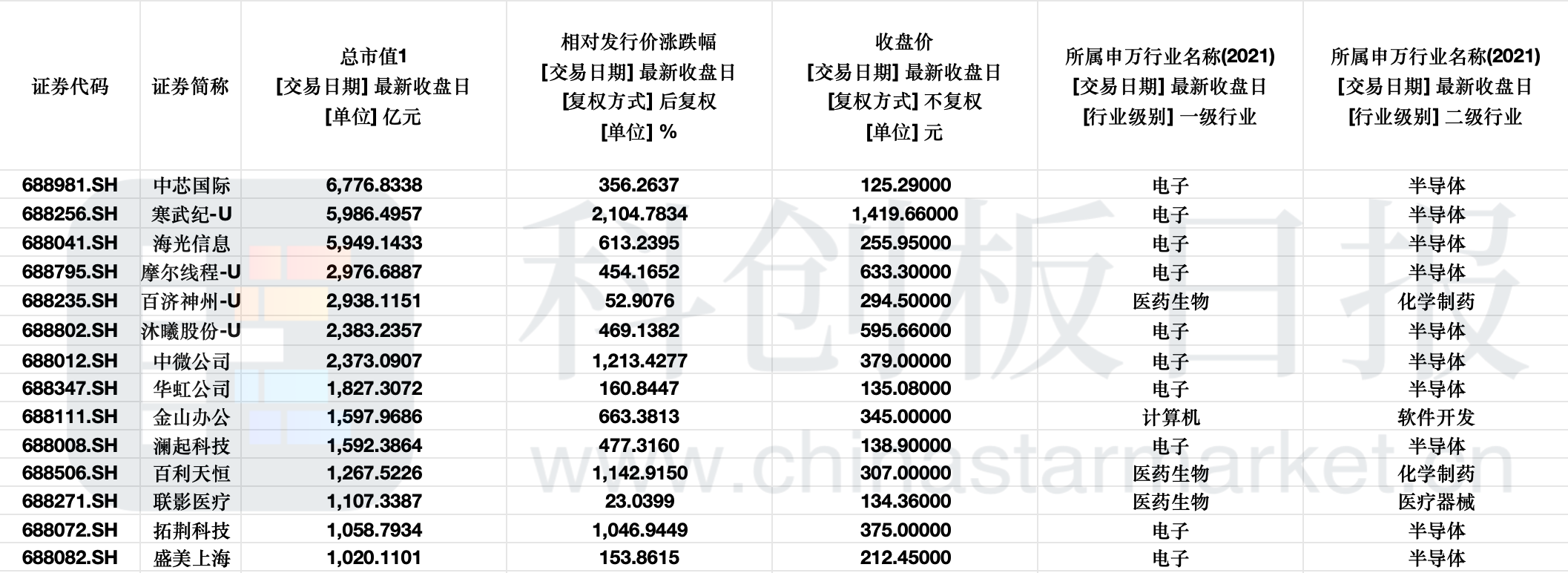 此外在科创板百元股中,有14家公司市值超过千亿。