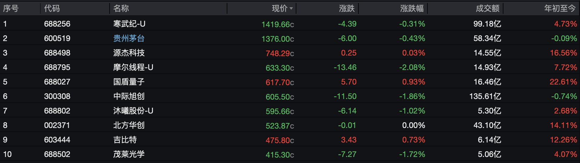 A股百元股中科技新贵扎堆。其中,寒武纪今日(1月19日)收盘价以1419.66元/股,超过贵州茅台,在A股公司中居于首位;而在贵州茅台之后,紧接着是源杰科技、摩尔线程、国盾量子,三家科创板公司股价1月19日收盘居于A股前五。