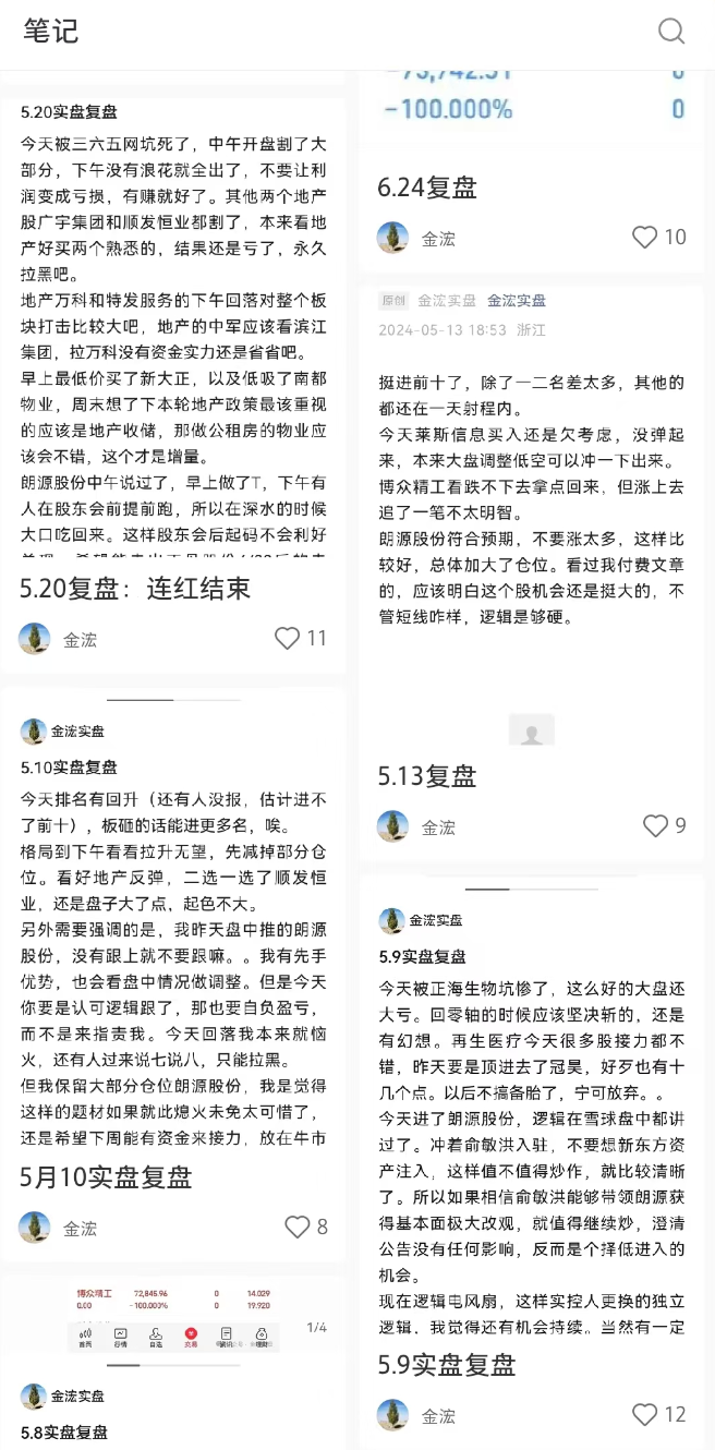 财联社记者注意到,截至发稿,在雪球平台已搜索不到“金浤”这一账号,而他在小红书、微信公众号上的账号依旧可以被关注。页面上,多数内容还是此前熟悉的复盘日记和持仓记录,间或提到个别股票,账号简介里仍写着“实盘模拟冠军”等标签,并点名罗列过往重点操作过的标的。