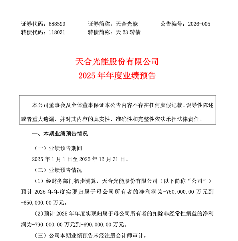 《科创板日报》1月20日讯(记者 王楚凡) 今日(1月19日),天合光能发布2025年度业绩预告。