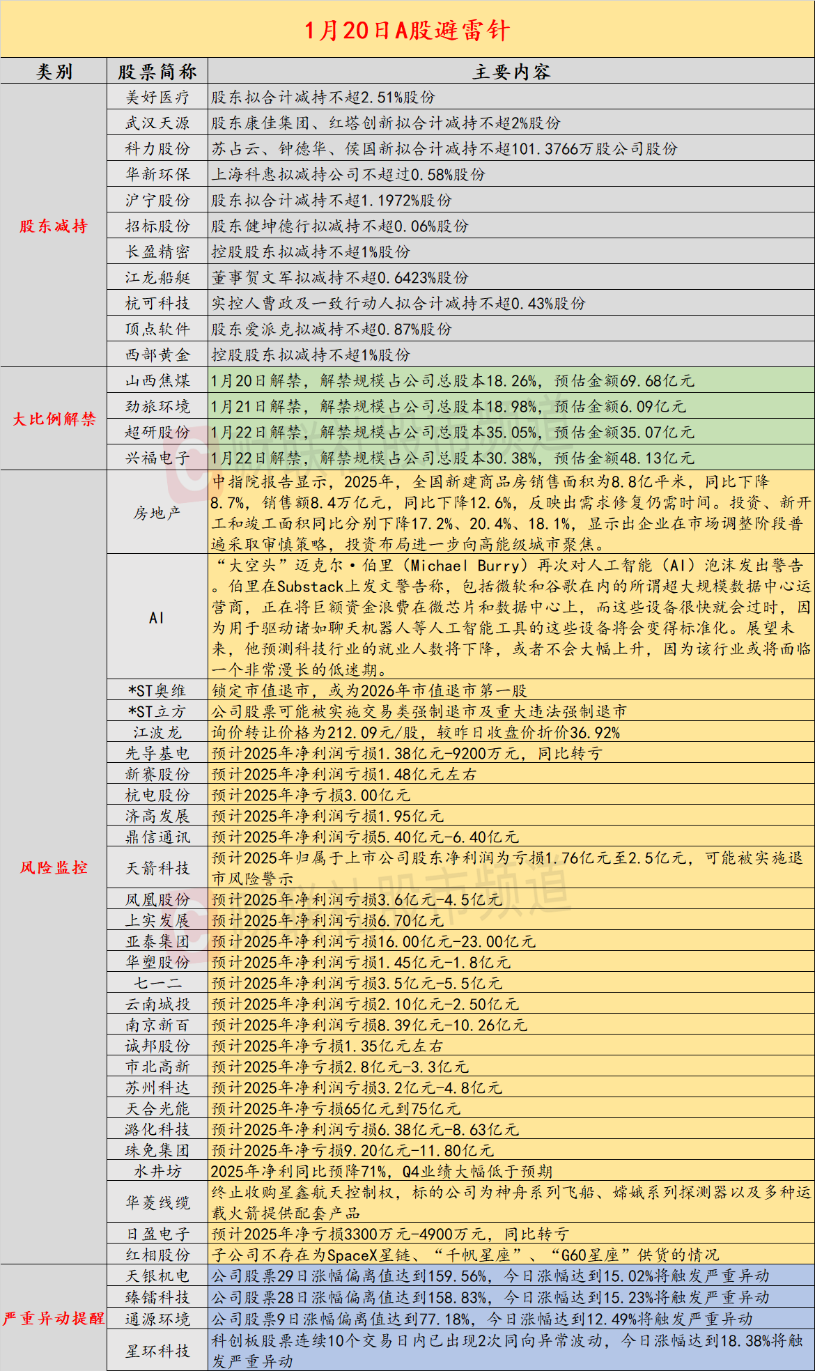 导读:财联社1月20日投资避雷针,近日,A股及海外市场潜在风险事件如下。国内经济信息方面包括:1)国内商品期市夜盘多数下跌,黑色系跌幅居前焦炭跌2.48%;2)2025年全国新建商品房销售面积同比下降8.7%,需求修复仍需时间;公司方面重点关注包括:1)*ST奥维锁定市值退市,或为2026年市值退市第一股;2)*ST立方公司股票可能被实施交易类强制退市及重大违法强制退市;海外市场重点关注包括:1)特朗普再掀贸易摩擦,欧洲主要股指收盘集体下跌;2)“大空头”再次对AI泡沫发出警告,行业或将面临漫长低迷期。