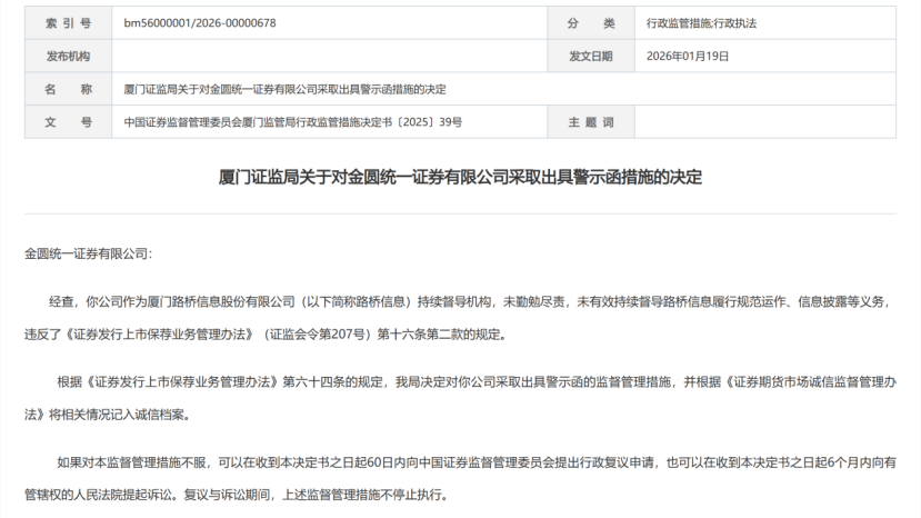 1月19日,厦门证监局发布的公告指出,金圆统一证券未勤勉尽责,未能有效持续督导路桥信息履行规范运作、信息披露等法定义务,违反《证券发行上市保荐业务管理办法》相关规定,决定对其采取出具警示函的监督管理措施,并按规定记入证券期货市场诚信档案。