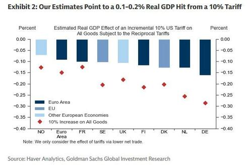 高盛认为,10%的关税将通过减少出口,使受影响欧洲国家的实际国内生产总值(GDP)下降0.1%至0.2%。与此同时,通胀影响可能非常微小,在其他条件不变的情况下,泰勒规则将指向适度下调政策利率。