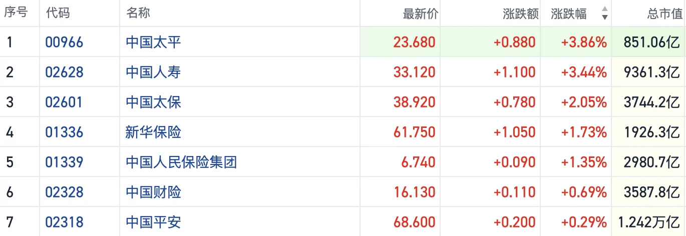 截至发稿,中国太平(00966.HK)涨近4%,中国人寿(02628.HK)涨超3%,新华保险(01336.HK)等险企也纷纷跟涨。