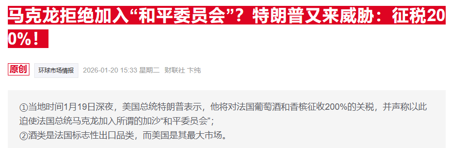 就在隔夜,特朗普又表示,他将对法国葡萄酒和香槟征收200%的关税,并声称以此迫使法国总统马克龙加入所谓的加沙“和平委员会”。