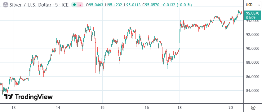 具体行情显示,北京时间17:00左右,现货白银升破95美元,最高报每盎司95.51美元,再度刷新历史纪录,发稿时交投于95美元附近,日内涨幅约0.9%,前一日银价涨近4.7%。