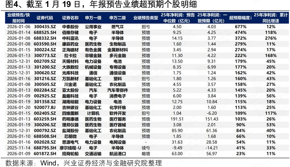 其次,当前年报预告业绩超预期的个股主要集中在电子、新能源、化工、医药等行业。我们将个股净利润预告中位数/快报净利润超出披露前一致预期10%以上定义为“业绩超预期”,当前来看主要集中在:电子(半导体、消费电子)、新能源(电池、电网设备)、化工(农化制品)、医药(创新药、医疗器械)等。