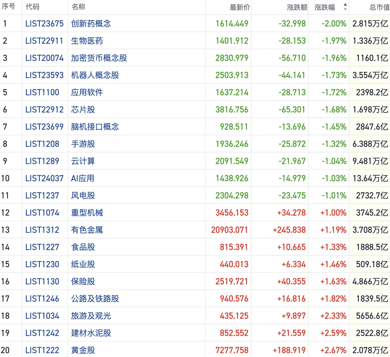 其他方向上,消费电子、生物医药、汽车、半导体芯片的行业集体走弱。