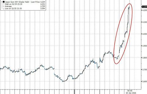 除了围绕格陵兰岛归属引发的关税和地缘政治争端外,周二全球市场的另一大风暴眼无疑在日本。日本长期国债收益率在时隔30年后首度冲破4%大关的背景下,当地债市的抛售变得一发不可收。这也令美国财长贝森特找到了将美债大跌“甩锅”日本的理由……