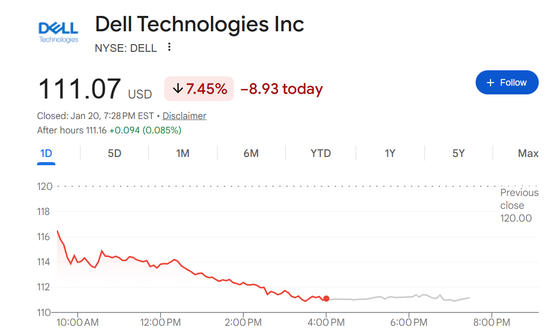 戴尔科技公司的股价大跌7.45%