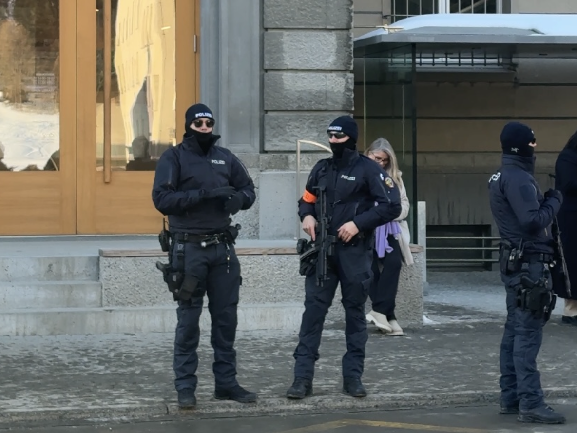 这是1月22日,今年达沃斯年会开幕以来的第三天。走在达沃斯小镇狭窄的街道上,肉眼可见的警力增多了,荷枪实弹的军警在路口徘徊,酒店门前的路障也更加厚重,时有直升机在山谷间盘旋。路上的车也更多了、更挤了——美国人来了。