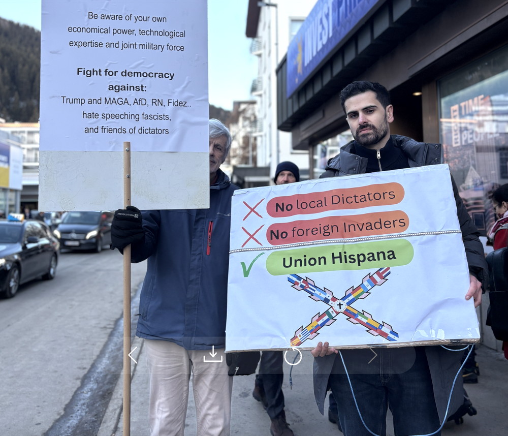 达沃斯街头因为格陵兰岛而强烈抗议特朗普的欧洲人。由作者拍摄