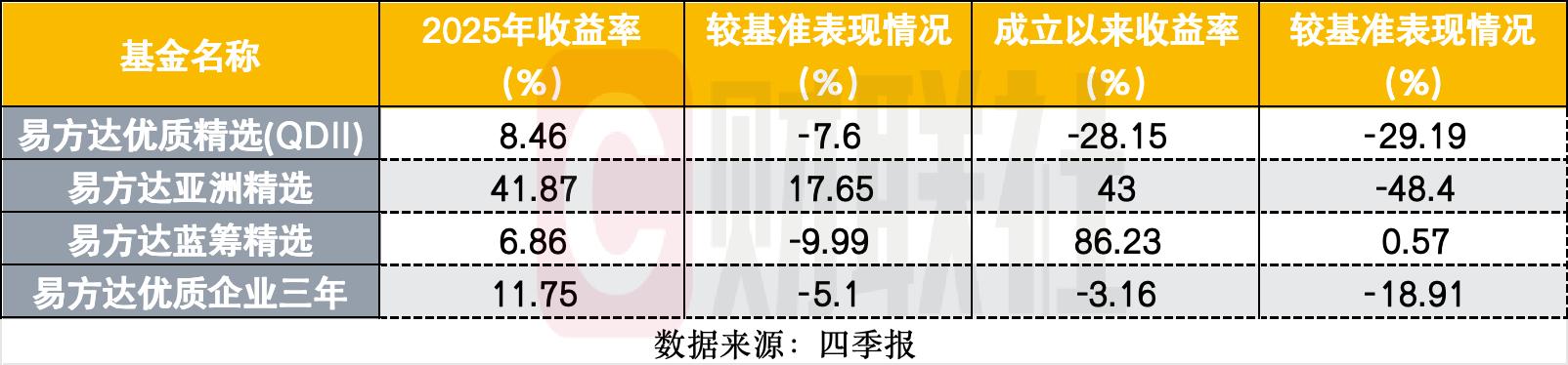 过去一年,易方达优质精选(QDII)、易方达亚洲精选、易方达蓝筹精选、易方达优质企业三年的二季度收益率分别为8.46%、41.87%、6.86%、11.75%。除了易方达亚洲精选跑赢基准17.65%,其余同期业绩均低于基准。