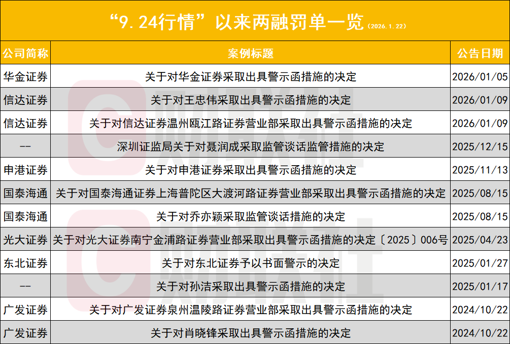 随着市场的火热,两融罚单偶发性出现,截至1月22日,自“9.24行情”以来,两融罚单已有12张,从月度罚单数量频率来看,今年1月稍多,合计有3张;其他月度情况为,2024年10月有2张,2025年1月、8月均有2张,同年4月、11月、12月各有1张。