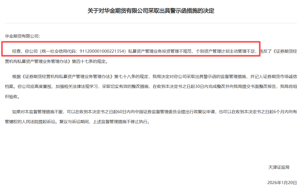 财联社1月22日讯(记者 高艳云)上海证监局与天津证监局近日相继披露罚单,华金证券、华金期货分别因融资融券业务资金管理失误、私募资管业务主动管理不足等问题被出具警示函。