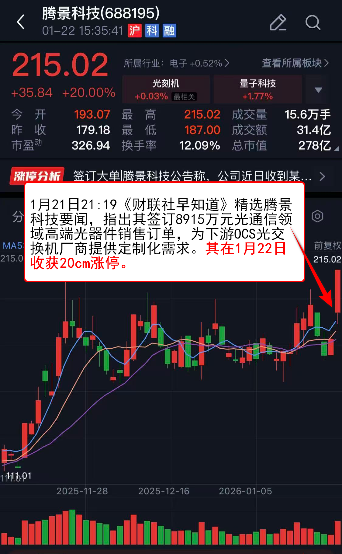 1月21日21:19《财联社早知道》精选腾景科技要闻,指出其签订8915万元光通信领域高端光器件销售订单,为下游OCS光交换机厂商提供定制化需求。其在1月22日收获20cm涨停。