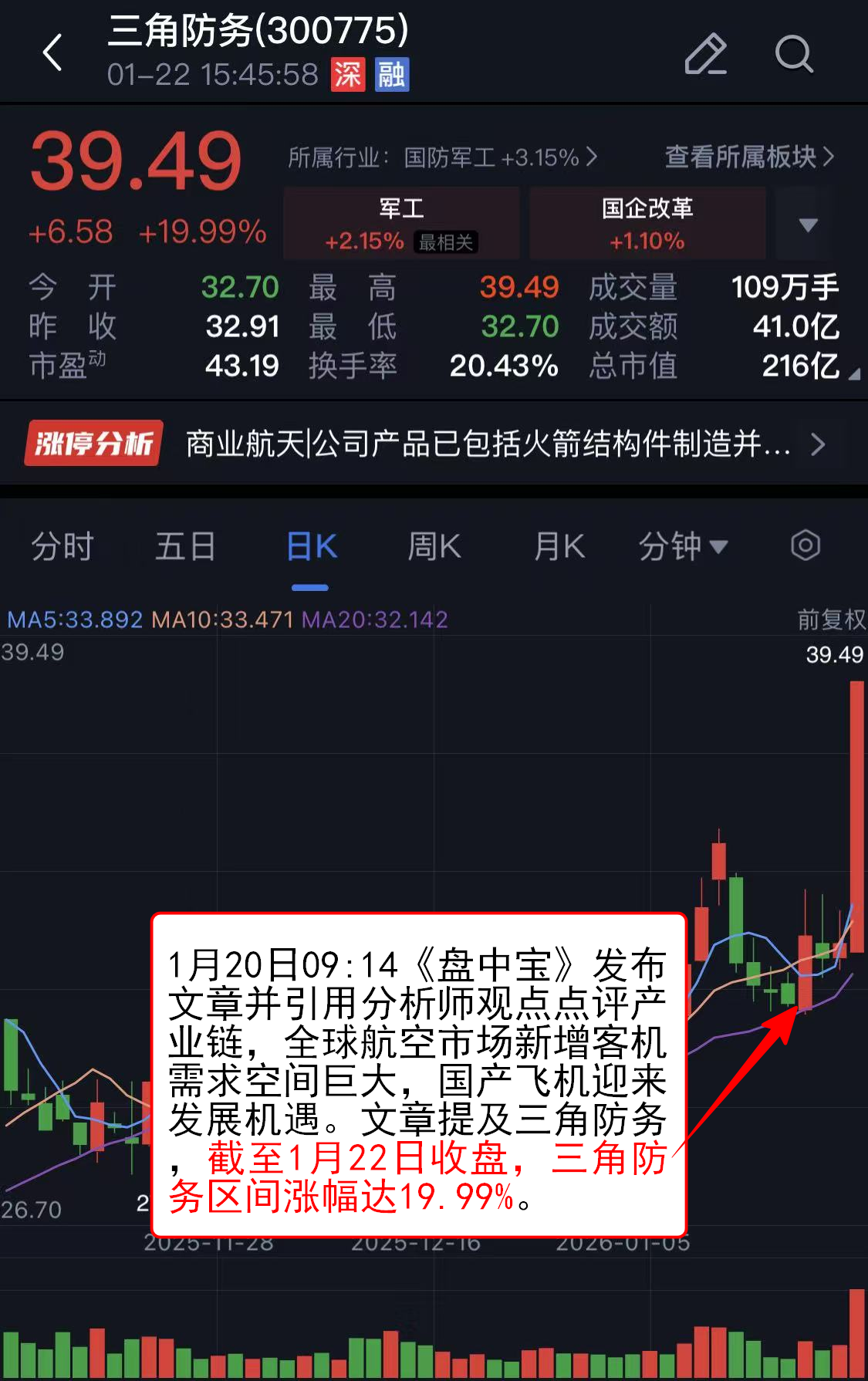 1月20日09:14《盘中宝》发布文章并引用分析师观点点评产业链,全球航空市场新增客机需求空间巨大,国产飞机迎来发展机遇。文章提及三角防务,截至1月22日收盘,三角防务区间涨幅达19.99%。
